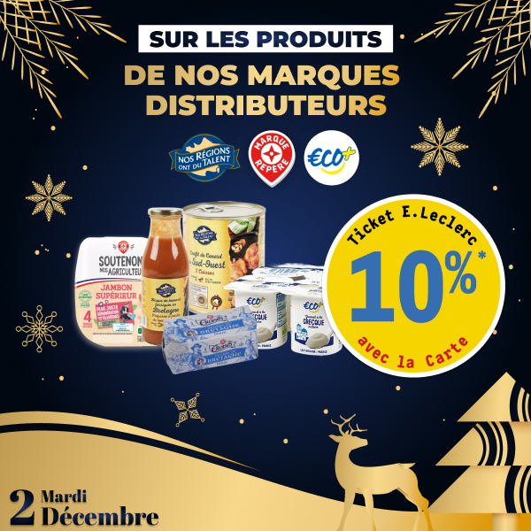*Uniquement le mardi 2 décembre dans votre Centre E.Leclerc Thiers. Offre reservée aux porteurs de la carte de fidélité. Création possible de la carte E.Leclerc à l’accueil. Offre non cumulable avec d’autres offres en cours. Voir conditions en magasin