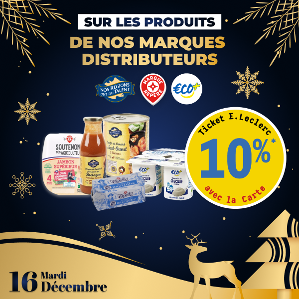 *Uniquement le mardi 16 décembre dans votre Centre E.Leclerc Thiers. Offre reservée aux porteurs de la carte de fidélité. Création possible de la carte E.Leclerc à l’accueil. Offre non cumulable avec d’autres offres en cours. Voir conditions en magasin