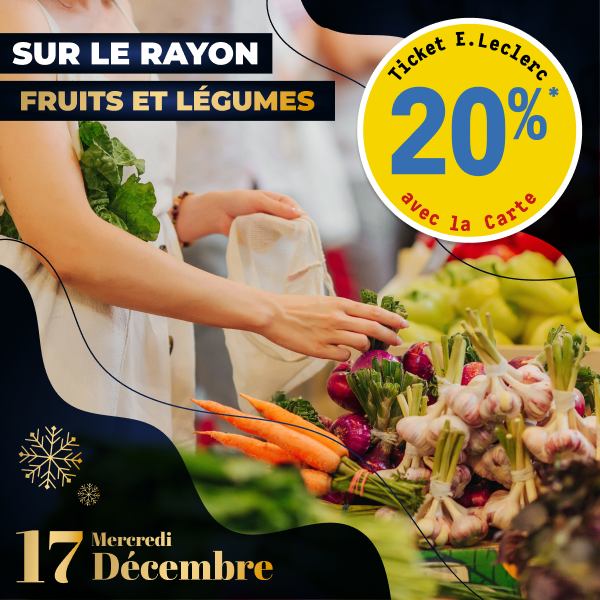 *Uniquement le mercredi 17 décembre dans votre Centre E.Leclerc Thiers. Offre reservée aux porteurs de la carte de fidélité. Création possible de la carte E.Leclerc à l’accueil. Offre non cumulable avec d’autres offres en cours. Voir conditions en magasin